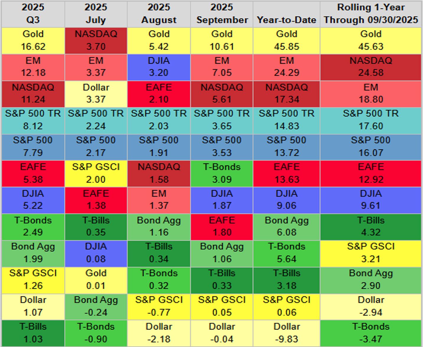 Financial markets worldwide continued to rally in the third quarter of the year. The panic of Liberation Day, now seven months past, seems a distant memory. Equities continued to rally as fears of recession gave way to fears of missing out (FOMO) on the AI capital investment boom. Fixed-income markets rallied as the world’s central bankers became more accommodative. In fact, in the last two months, not a single central bank has raised interest rates. Even the Fed got in the act, as Jerome Powell, bruised and bloodied by Presidential criticism, led the Fed in a 25-basis-point rate cut in September and another 25 basis points in late October. Gold actually led broad asset returns in the quarter. It is unusual ( you have to go back to the first quarter of 2019) to see a period when everything goes up, as highlighted in the asset return quilt for the quarter.