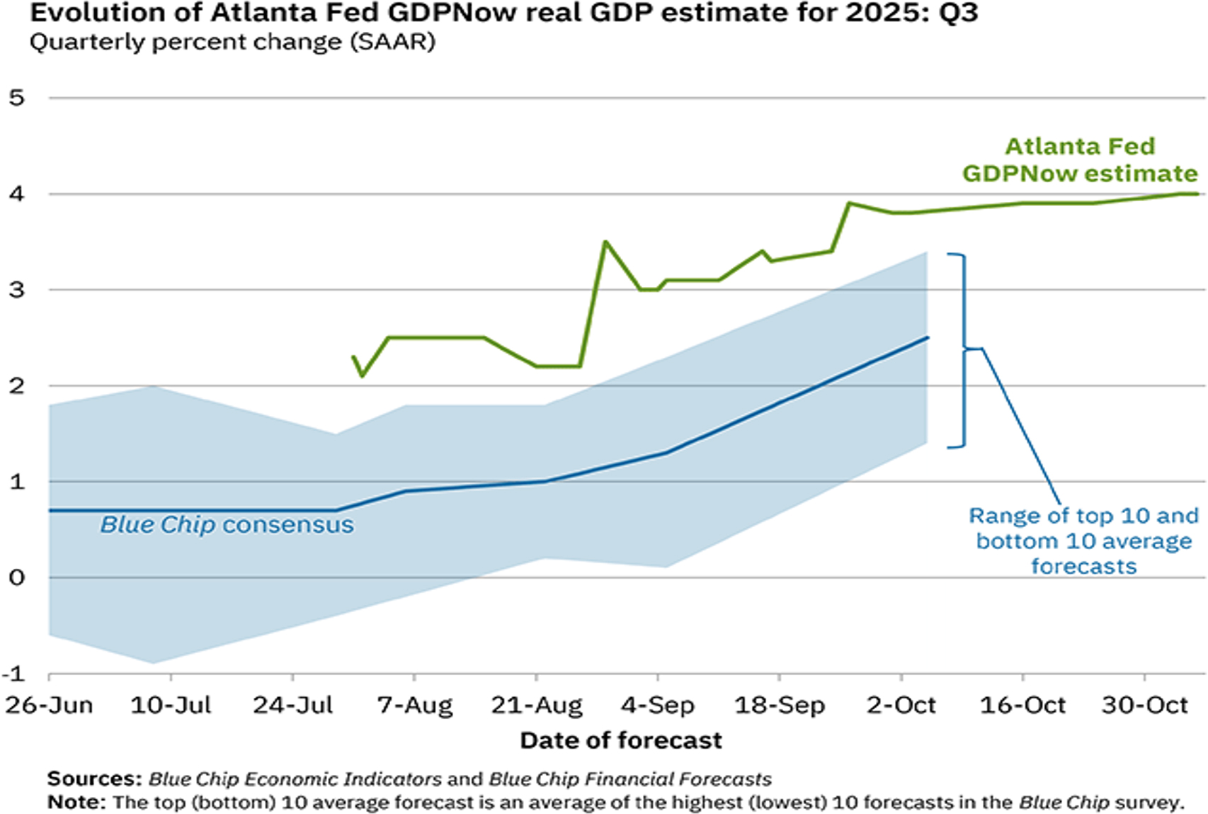 We also need to note, however, what hasn’t taken place in the past seven months. Clearly, the US hasn’t entered a recession. Economists were united in the view that the administration’s high tariffs would tip the US and global economies into contraction. While we currently don’t have economic data being released (thank you, government shutdown!), the Atlanta Federal Reserve maintains an online, real-time tracker of projected GDP. Their efforts have proven more accurate than the economic consensus. As shown in the chart below, the third-quarter GDP is forecast to grow at a 4% rate.