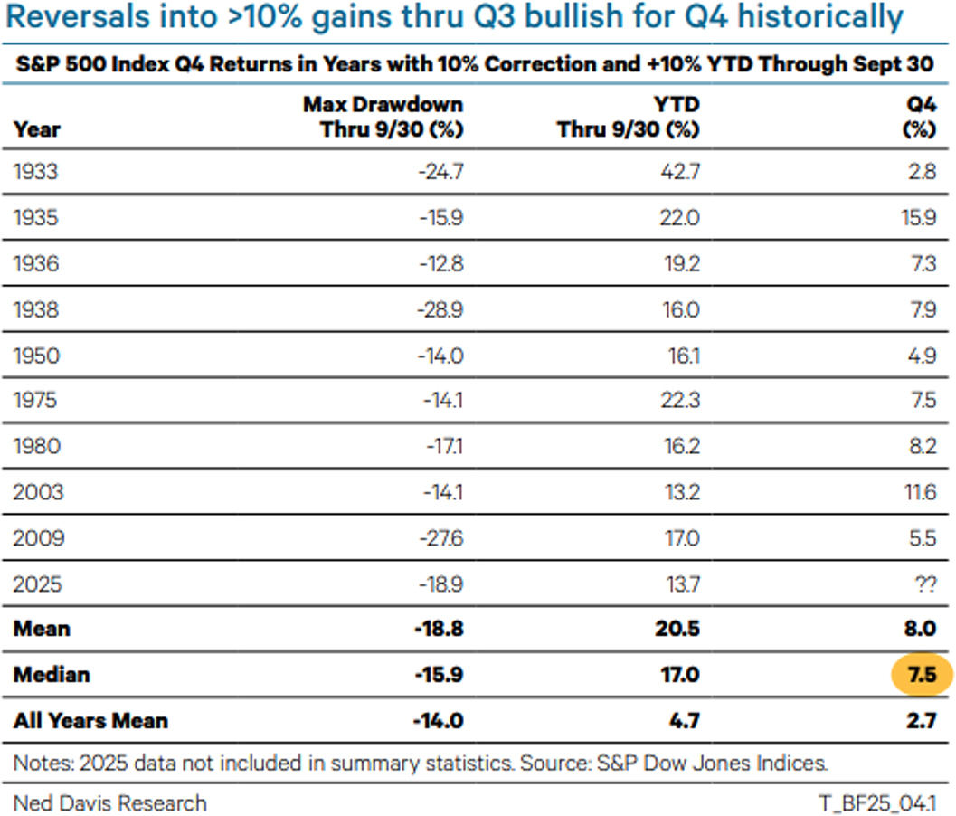 Currently, equities are reaching all-time highs against a backdrop of a growing economy and lower global interest rates. When you couple that with the strong rebound off the spring lows, the outlook is impressive. In the prior cases where equities had a 10% correction and were still up 10% by the end of September, the market has rallied in the fourth quarter every time, with median gains of 7.5%.
