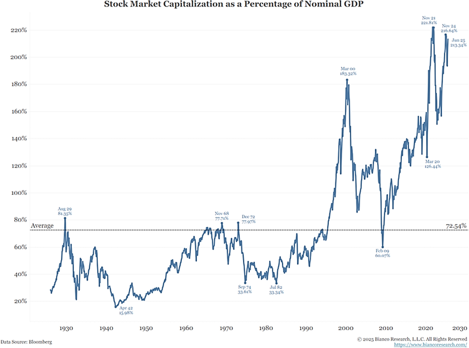 Given this history, why wouldn’t an investor go all in? The simple answer is that stocks are, by any measure, somewhere between fully valued and very expensive. Warren Buffett’s favorite stock market indicator, comparing total stock market values to GDP, shows that there have been few times in history when stocks haven’t been pricier:
