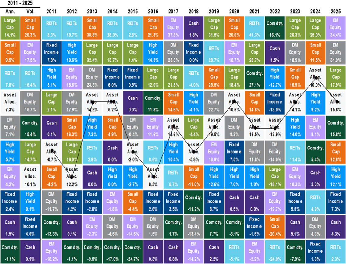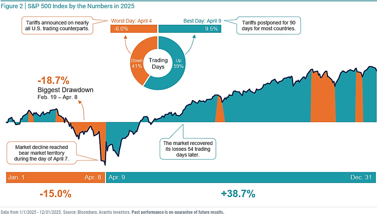 Looking back, despite the turmoil, it was a year that actually reinforced many time-tested principles. First, and most importantly, volatility is a part of investing. The 2025 rollercoaster illustrated below highlights the wild swings. April was particularly turbulent as tariff announcements, followed quickly by the administration’s backtracking, created huge up and down swings within the same week.