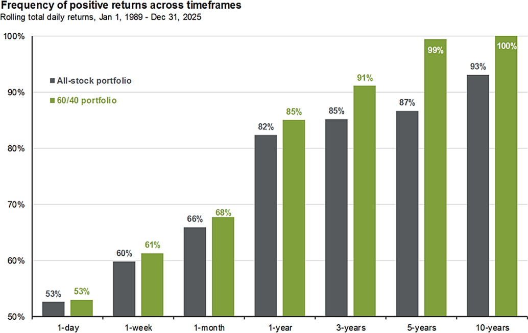 An alternative way to consider the benefits of diversification and holding period is to analyze the frequency of positive returns. On a given day or week, the results for an all-stock portfolio versus a diversified portfolio are a coin toss. For every long-term period, however, diversification meaningfully reduces the likelihood of negative returns: